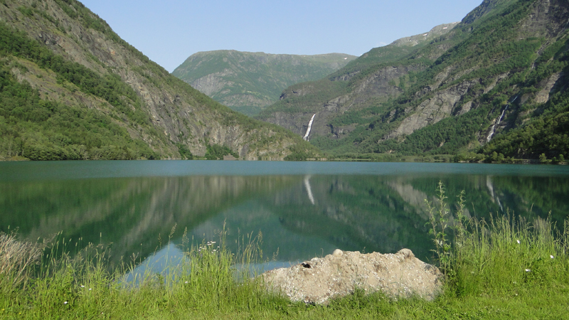 Campingplatz Skjolden am Ende des Lustrafjorden. Der Platz ist in Terrassen an einem See angelegt, es gibt rund herum