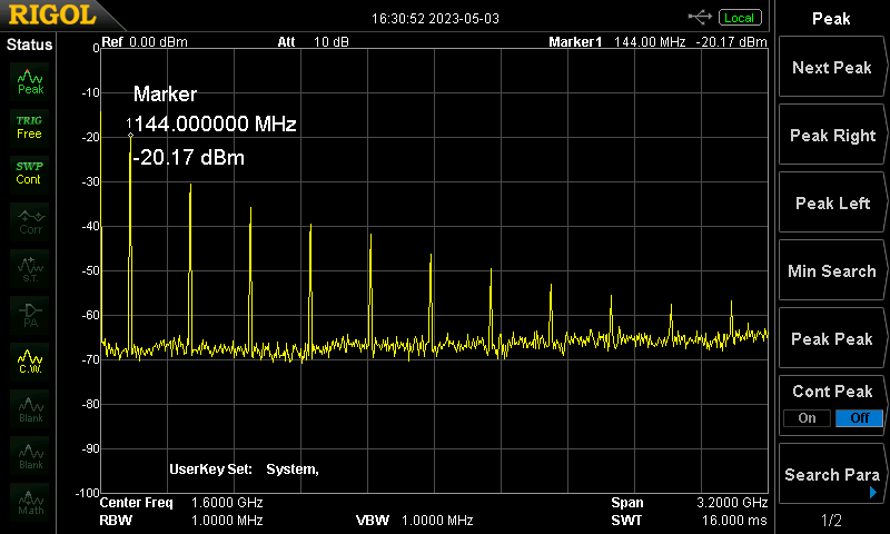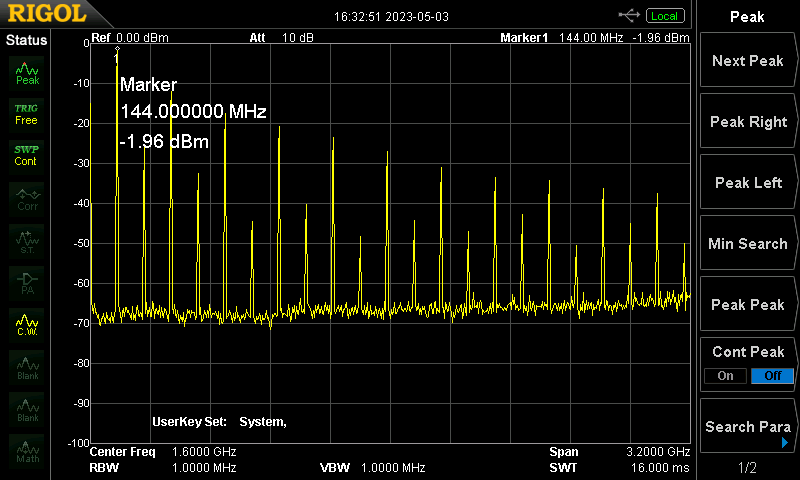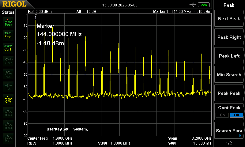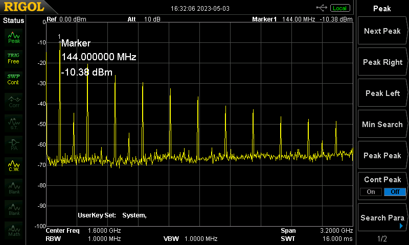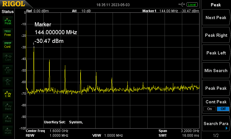 144 MHz, Gain 73 db, Output = ca. +10 dBm (Jetzt kommen noch f * 2, f * 4, f * 6, ... hinzu)