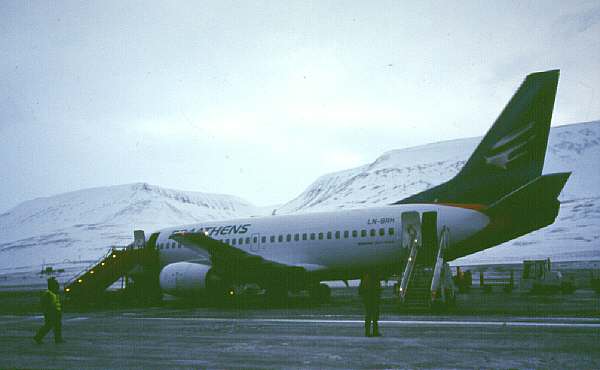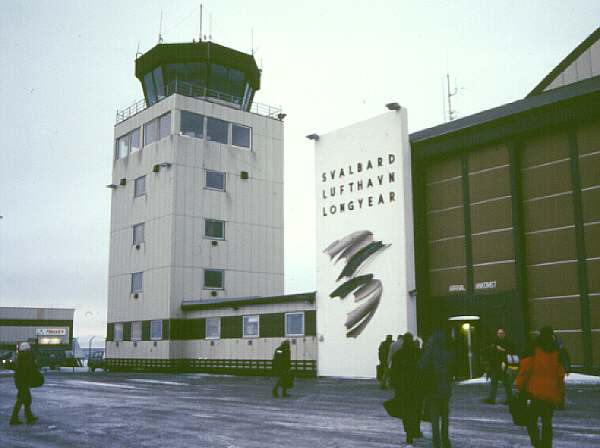 Eine 737 von Braathens bringt uns in etwa 1 1/2 Stunden Flugzeit nach Spitzbergen (die Norweger nennen die Inselgruppe "Svalbard"). In Longyearbyen angekommen fahren wir mit dem Bus zum "Funken-Hotel" in dem wir nun bis Freitag wohnen werden. Schon der kurze Aufenthalt im Freien bei der Ankunft zeigt uns dass wir in der Arktis sind. Die Wetterstation im Adventdalen bei Longyearbyen mißt -16° C Lufttemperatur und -35° C Windchill (das ist die "gefühlte" Temperatur, also ein Wert bei dem die Auskühlung durch den Wind berücksichtigt ist).