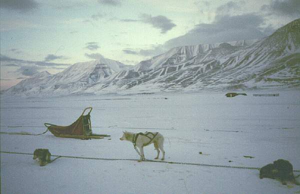 Dann geht es zu den Schlitten. Für zwei Leute einen Schlitten. Eine(r) sitzt drauf, oder eigentlich mehr drin, eine(r) steht hinten drauf. Wer hinten draufsteht bedient die Bremse (Ein Blech, das mit einem Pedal in den Schnee getreten wird). Die sechs Hunde rennen einfach dem voranfahrenden Schlitten nach. Nur der Leithund am ersten Schlitten versteht die Befehle "VENSTRE!!!" (Links) oder "HØYRE!!!" (Rechts) des Führers. Beim Anhalten kann der Schlitten zusätzlich mit einem Anker befestigt werden.