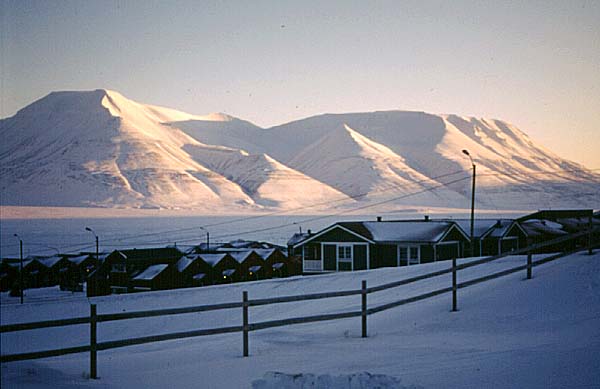 Blauer Himmel und auf den schneebedeckten Bergen liegt ein roter Schein der Sonne (Die Sonne selbst ist erst in der nächsten Woche zum ersten Mal in diesem Jahr in Longyearbyen zu sehen). Dafür hat es jetzt etwa -23°C.