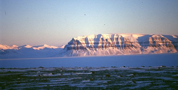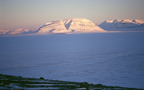 zugefrorenen Sassenfjord. Inzwischen ist es Mittag geworden und die