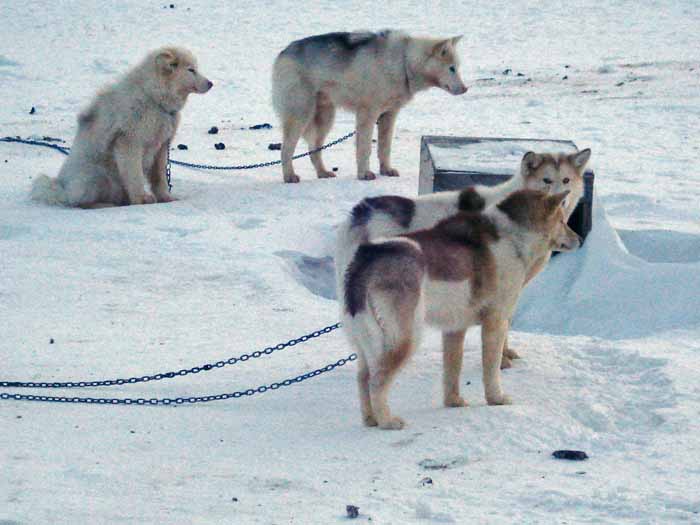 einkaufen und dann laufen wir durch den Ort und bewundern die kräftigen Schlittenhunde die uns überall mit