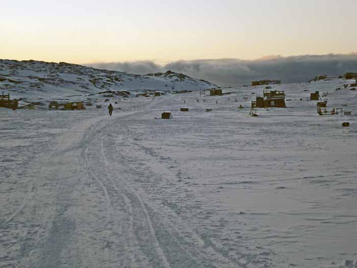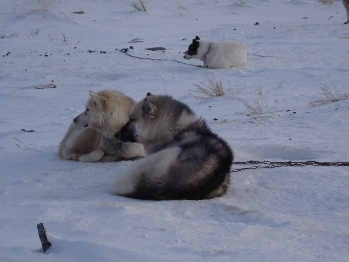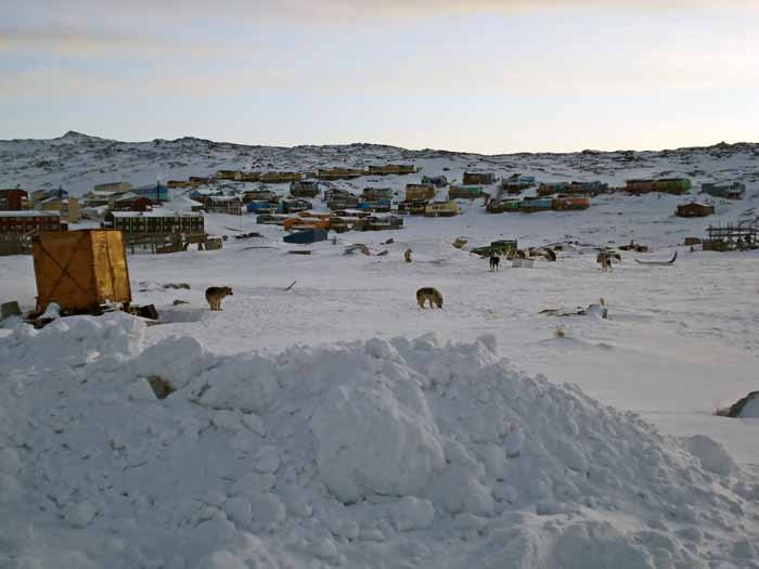 so dicht an den Ortsrand dass uns das Jaulen von etlichen Huskies aus dem Ort lockt.