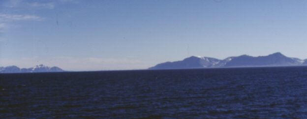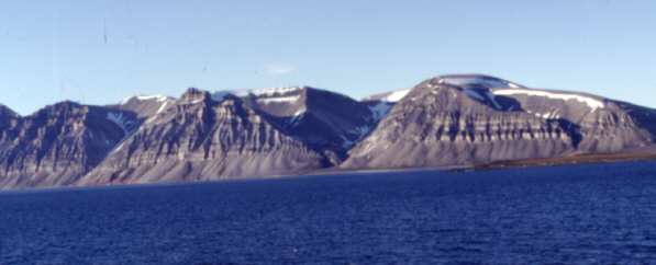 Als ich aufwache bemerke ich, daß das Schiff ganz ruhig fährt. Durch das Bullauge sehen wir blauen Himmel und blaugrünes Wasser. Sonne! Eigentlich müßte doch jetzt schon die Küste zu sehen sein? Aber die ist auf der anderen Seite des Schiffs! Also schnell einsatzfähig machen und hoch und raus auf das Deck. Brrr.. Hier ist es kalt! Wir sind in der Arktis! Aus dem Wasser ragt in einiger Entfernung die Küste empor. Wir sind am Sørkap, der Südspitze Spitzbergens, vorbei und fahren der Küste entlang nach Norden. Das Land besteht aus unheimlich vielen, meistens schneebedeckten Bergen. Die Farben sind anthrazit bis braun und viel weiß. Dazu blaugrünes Wasser, hellblauer Himmel und Sonne! Die Berge sind alle dreieckig und spitz. Deshalb "Spitzbergen"? Kann schon sein.