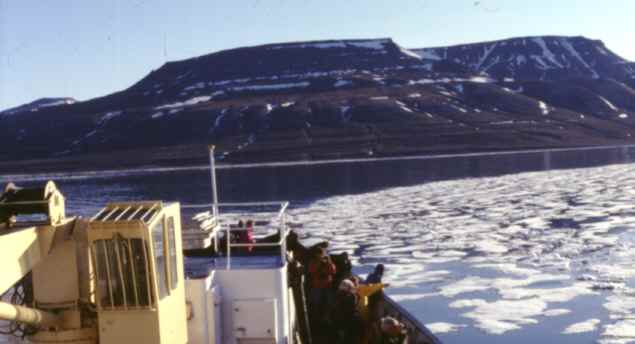 Dann geht die Fahrt weiter in den Tempelfjorden. Er heisst so, weil die Bergformationen an Tempel erinnern. Weiter geht es in den Billefjord. Hier könnte man bis zu der russischen Siedlung "Pyramiden" fahren, aber es ist noch zuviel Eis im Fjord. Durch die ersten Eisschollen fahren wir noch krachend hindurch, die Nordstjernen ist bedingt eisgängig, aber dann wird es dem Kapitän zuviel und das Schiff dreht wieder ab. Die Eisschollen im Fjord sind trotzdem beeindruckend.