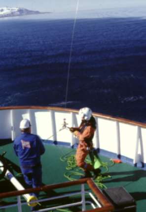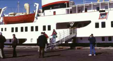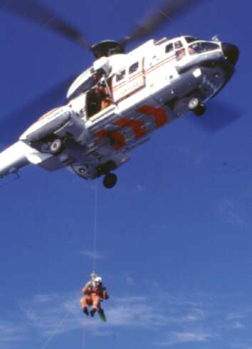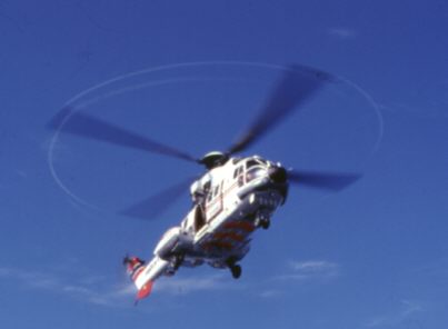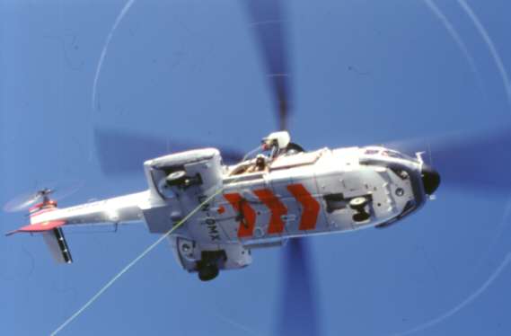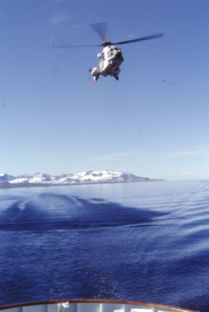 Plötzlich erscheinen ein paar Leute der Schiffsbesatzung und räumen den hinteren Teil des Decks frei. Alle dort befindlichen Passagiere werden gebeten ein Deck höher zu gehen. Die Schiffsflagge wird abgenommen und der Fahnenmast eingeklappt. Was geschieht nun? Ich habe es rechtzeitig erfahren und mir einen guten Platz auf dem oberen Deck gesichert: Es soll eine Hubschrauberübung geben. Die Polizeitruppe des "Sysselmanns" (Gouverneur der Inselgruppe) soll üben sich auf ein Schiff abzuseilen. Es erscheinen zwei große Hubschrauber. Einer hält sich ein Stück entfernt und beobachtet die Übung, der zweite steht so etwa zwanzig bis dreißig Meter über dem Schiff. Ohrenbetäubender Lärm. Die Tür wird geöffnet und eine Leine heruntergeworfen, die von der Schiffsmannschaft gehalten wird. Dann werden drei Personen mit einem Kran entlang des Seils auf unser Schiff gebracht. Ein Mann und zwei Frauen in der Uniform der Polizei des Sysselmanns. Der Hubschrauber dreht ab und fliegt das Schiff erneut an. Wieder wird ein Seil heruntergeworfen. Nun werden die drei wieder mit dem Kran hochgezogen und im Hubschrauber aufgenommen. Unsere Bewunderung ist ihnen sicher. Wer von uns sich das wohl getraut hätte? Eine tolle Flugschaueinlage. Es hat mindestens einen halben Diafilm gekostet!