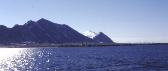 Am Eingang des Isfjorden kann man einige Gebäude und große Parabolantennen erkennen. Das ist "Isfjord-Radio", die Telekommunikationsverbindung von dieser Insel über Satellit zum norwegischen Festland. Wir sind nun etwa 800 km nördlich des Nordkaps, das von vielen Touristen für den nördlichsten Punkt der Welt gehalten wird, den man erreichen kann. Wir fahren in den Isfjorden hinein.