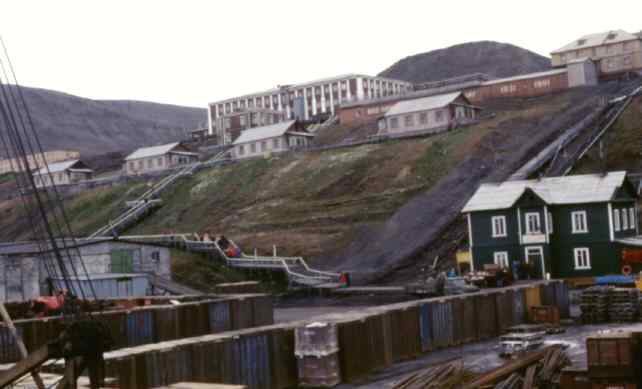 Uhr in Barentsburg an. Die Siedlung liegt an einem recht steilen Hang.