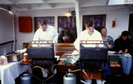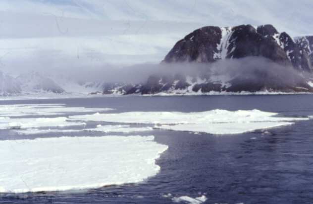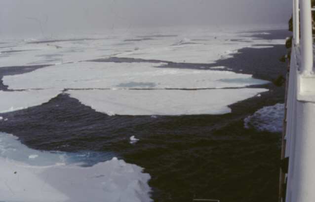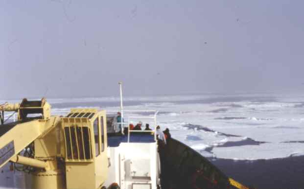 Als nächstes versucht der Kapitän uns bis zum 80. Breitengrad nach Norden zu bringen. Das ist gar nicht so einfach, denn das Meer ist plötzlich mit Packeis bedeckt. Es geht nicht mehr weiter. Etwas über 1000 km Eis bis zum Nordpol! Mein Satellitennavigantionsgerät "Garmin GPS12" verrät mir, daß der nördlichste Punkt unserer Reise 79° 53' N und 10° 20' E ist. Also fast geschafft. Aber was macht das schon noch aus? Der Anblick des Eises entschädigt uns für die fehlenden 7 Minuten. Nun sind wir über 900 km nördlich des Nordkaps und 3313 km nördlich Frankfurt.