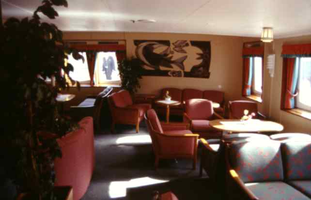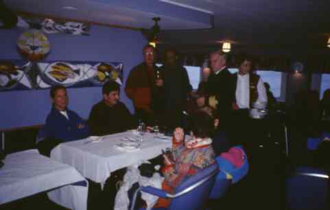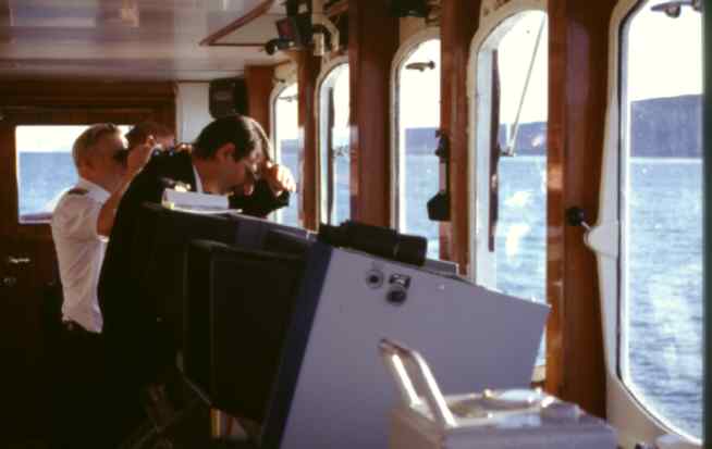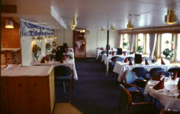 Es macht sich das Gerücht breit, daß sich das Wetter bessern soll, wenn wir an Bjørnøa (Bäreninsel) vorbei sind. Alle hoffen, daß das stimmt. Gegen Abend wird das Wetter tatsächlich besser. Ganz plötzlich geht es mir wieder gut und ich habe einen riesigen Hunger. Es gibt Abendessen, Lammbraten. Die Welt ist wieder in Ordnung! Nach dem Essen gibt es einen Diavortrag über die Aktivitäten in Spitzbergen und dann werden uns der Kapitän, der Maschinenchef und der Oberstuart von der Reiseleiterin, die fließend mindestens fünf Sprachen spricht, vorgestellt. Die anderen Passagiere kommen aus ganz Europa und USA. Es gibt zur Begrüßung Champagner und eine große Torte mit der "Nordstjernen" aus Schokolade drauf.