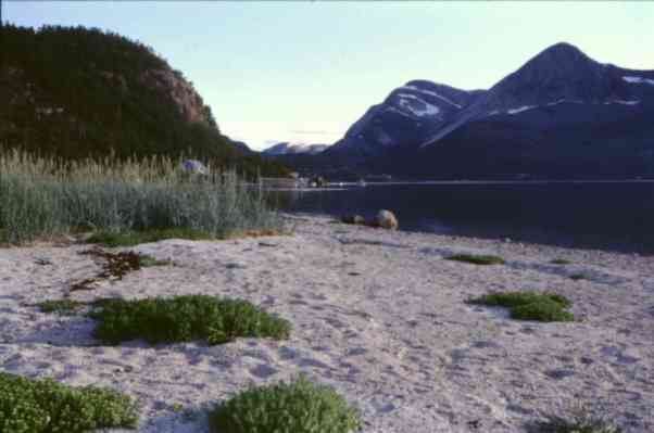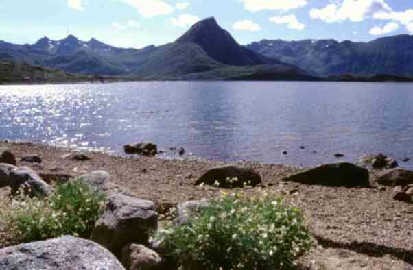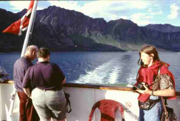 Wir fahren, jetzt mit drei Autos (Rose-Marie und Hartmut im dritten Wagen), auf der E8 wieder zurück bis zur E6 und dann weiter nach Süden.. Über Finnsnes geht es auf die Insel Senjaund auf der Reichsstraße 86 nach Gryllefjord. Frank hat Recht, das Wetter ist hier immer noch sehr gut, sommerlich warm. Mit der Fähre fahren wir eineinhalb Stunden nach Andenes auf die Vesterålen. Die Fähre ist mit 310,- NOK nicht ganz billig, dafür wird auch guter Seegang geboten. Unterwegs sehe ich auch das Boot "Reine", auf dem ich vor ein paar Jahren an einer Walsafari von Andenes aus teilgenommen habe.