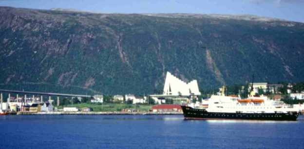 Die "M/S Harald Jarl" verläßt Tromsø nordwärts. Im Hintergrund die Eismeerkathedrale