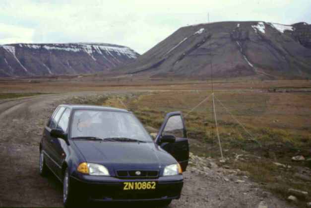 Rechts neben dem Auto eine Groundplaneantenne (4,90 m) die zerlegt