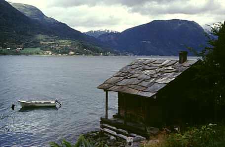 Ein gewisses Problem stellt sich dem Touristen, da die Straße hier einfach am Wasser endet. Als erfahrener Tourist weiss man jedoch, daß in dieser Situation oft eine Fähre weiterhilft, zumal auch in der Landkarte eine eingezeichnet ist. Etwas warten an einem Fähranleger bringt den erhofften Erfolg: Eine winzig kleine Fähre kommt und bringt uns sicher über den Fjord nach Solvorn. So kommen wir wieder auf die Straße 55 und haben nun den Lustrafjorden umrundet.