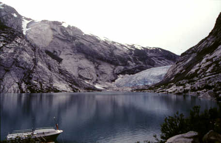 Ein kleines Stück folgen wir der 55 nach Norden bis wir auf die Straße 604 in das Jostedalen abbiegen. Das Ziel hier ist der Gletscher Nigardsbreen, dem wir auch einmal wieder einen Besuch abstatten wollen. Leider regnet es wieder etwas, aber für ein paar Fotomotive ist der Gletscher immer gut. Leider ist es für die Bootsfahrt zum Gletscher zu spät, bei dem Wetter wäre es sicher auch nicht nur schön. So begnügen wir uns mit ein paar Auffnahmen mit dem Teleobjektiv. In der Nähe des Gletschers gibt es auch noch ein Besucherzentrum, das wir aber leider nur im Schnelldurchlauf besuchen können, weil es auch bald schließt. Man kann hier viel über Gletscher lernen und sich eine Diashow über die Gegend hier ansehen.