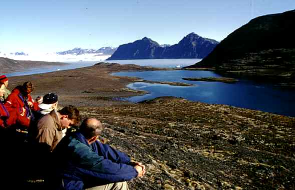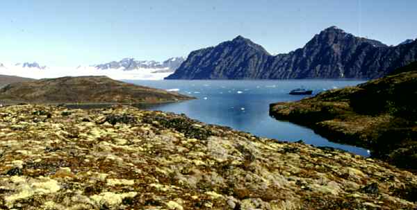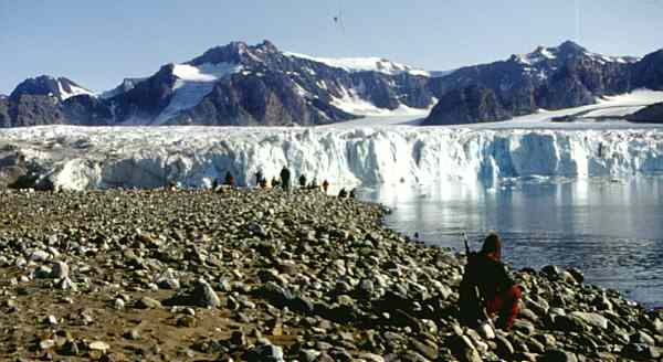 Wir wandern weiter um den See herum bis wir wieder an den Fjord zurückkommen und mit den Zodiacs zum Schiff zurückfahren. Dort wartet schon das Mittagessen auf uns, wir sind wieder richtig hungrig. Während wir essen fährt uns die "M/S Brand" zum nächsten Landeplatz. Aus dem Lilliehöökfjorden fahren wir zurück in den Krossfjorden und ankern am "Fjortende Julibreen" (79° 0' N, 12° 0' E).Der Gletscher wurde nach dem französischen Nationalfeiertag, dem 14. Juli, benannt. Wir booten wieder mit den Zodiacs aus. Wir haben inzwischen viel Übung im Anlegen der Schwimmwesten und freuen uns schon jedesmal wieder riesig auf die rasante Fahrt im Schlauchboot über das Wasser, das ca. 0° C hat und nur wegen seinem Salzgehalt nicht einfach einfriert. Zunächst wandern wir zu einem Vogelfelsen. Vor dem Vogelfelsen wachsen viele Pflanzen. Es ist richtig grün und es gibt tolle Blumen, bestimmt bis zu acht Zentimeter hoch!. Warum? Nun, es ist halt ein Vogelfelsen, da gibt es viel Dung. Das Geschrei der Vögel ist gigantisch. Aber auch andere Tiere lieben die Vogelfelsen. Polarfüchse rechnen sich gute Chancen auf Jungvögel aus, die den Flug vom Felsen zum Wasser nicht schaffen. Den Vögeln bleibt dann nur noch rennen. Polarfüchse können auch rennen.Vor dem Felsen ist ein kleiner Felsvorsprung. Es soll interessant sein sich darunterzustellen meint einer unserer Guides. Warum wohl, was soll da schon sein? Vorsichtig probiere ich es aus: Wenn man nur einen Schritt darunter macht ist es plötzlich totenstill. Geht man wieder raus ist das ganze Vogelgeschrei wieder da. Obwohl physikalisch gut erklärbar, es macht Spaß.