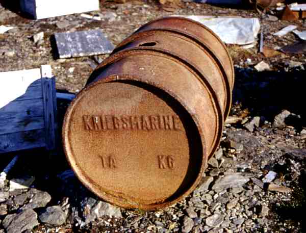 Fässer mit der Aufschrift "Kriegsmarine", die Reste eines Generators,