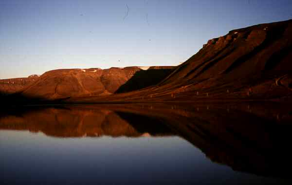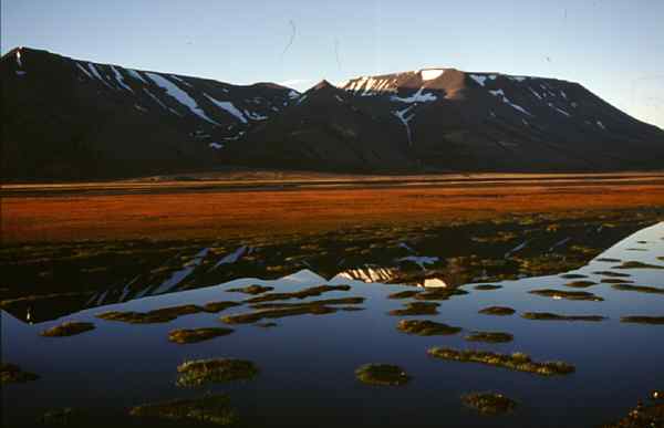 Nach dem Abendessen treibt uns die tiefstehende Sonne mit ihrem unglaublich roten Licht wieder hinaus. Diesmal gegen 23:00 Uhr in das Adventdalen. Es ist zeitweise völlig windstill. In den zahlreichen Seen und Wasserläufen spiegeln sich die Berge. Die Farben sind schon fast unwirklich. Die Arktis kann traumhaft schön sein! Fotomotive über Fotomotive!