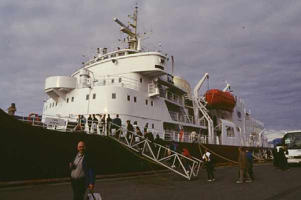 Gleich nach unserer Ankunft in Longyearbyen bringt uns ein Bus zum Schiff. Die "M/V Polar Star" ist ein Eisbrecher, der bis vor kurzem noch in der staatlichen schwedischen Eisbrecherflotte gefahren ist. Dann wurde er für touristische Expeditionen umgebaut und kann nun bis 100 Pasagiere in die Arktis oder Antarktis befördern. Heute sind 73 Passagiere an Bord.