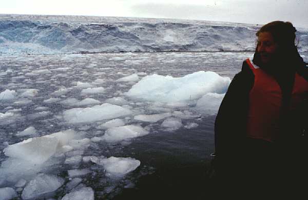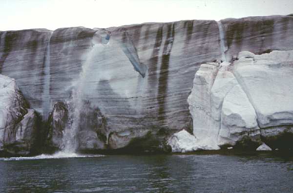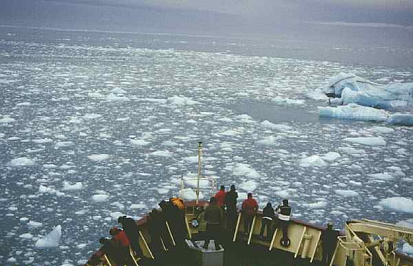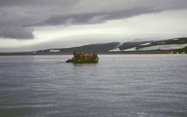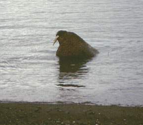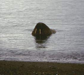 Nach dem Frühstück: Der Nebel ist weitgehend verschwunden. An Land erkennt man eine Walrosskolonie und - die absolute Sensation - einen kleinen weißen Punkt: Ein Eisbär! Ein richtiger Eisbär! Diesmal lebendig! Allerdings unheimlich weit weg und selbst im Fernglas nur ein kleiner weißer Punkt, der sich bewegt. Aber immerhin: Ein Eisbär! Unsere Guides haben beschlossen in kleinen Gruppen zu landen und die Walrösser zu beobachten. Eine gute Idee! Wir fahren mit den Zodiacs los und besichtigen zuerst eine interessante Gletscherfront. Es gibt richtige Wasserfälle aus dem Gletscher. Die unterschiedlich farbigen Eisschichten geben ein interessantes Bild ab. Plötzlich kracht es und der Gletscher kalbt. Eine hohe Welle läuft auf eins unserer Schlauchboote zu, das rasch die Flucht ergreift. Es ist, wie Herbert und Gabi, die in dem Boot waren, berichteten, auch schneller. Gut so, denn es wäre sonst ein kühles und feuchtes Erlebnis geworden. Die Wassertemperatur beträgt immer noch etwa null Grad.