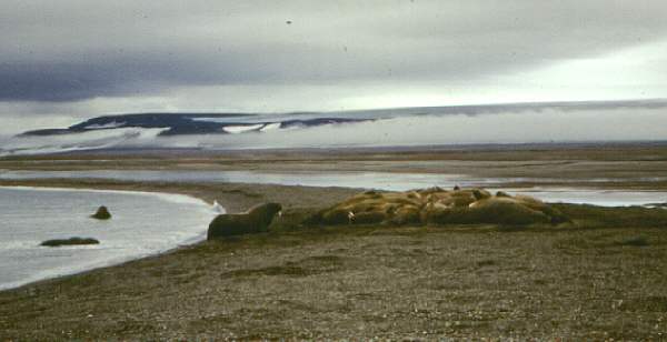 Ein Boot nach dem anderen landet in der Augustabukta (79° 24.552' N, 20° 45.174' E). Wir sind wieder auf der Insel Nordauslandet am Rand des Vegafonna. Nach der Landung nähern wir uns ganz langsam und leise den Walrossen, die sich von uns gar nicht stören lassen. Man kann sie so aus einigem Abstand gut beobachten und fotografieren. Hauptsächlich liegen sie fast bewegungslos dicht aneinandergedrängt herum und grunzen ab und zu vor sich hin. Sie tun eben das, was die meisten Tiere in der Arktis tun: Sie sparen Energie. Einige von ihnen sind auch im flachen Wasser, einer sogar nur ein par Meter von uns entfernt. So hat das Walross eine gute Gelegenheit eine Gruppe Touristen zu beobachten, was es auch ausgiebig tut.