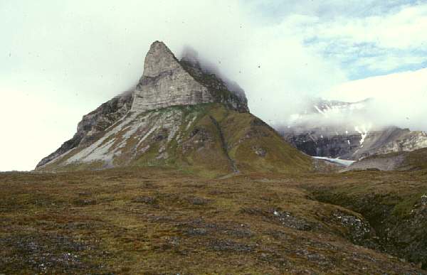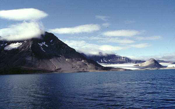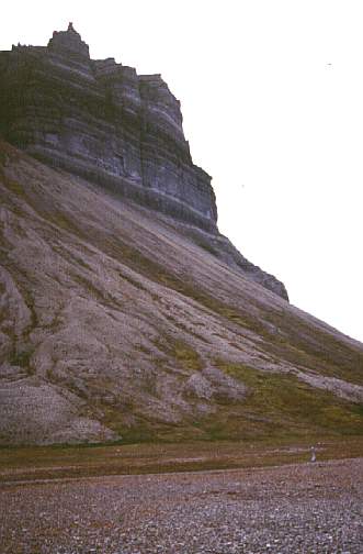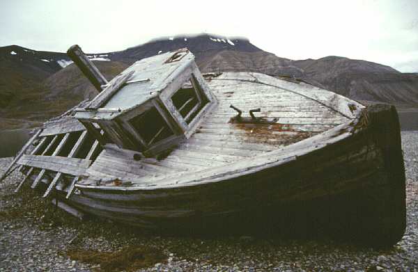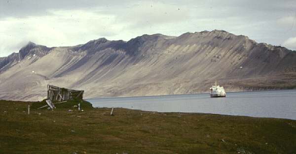 Während des Abendessens sind wir durch den Isfjorden gefahren und sind jetzt am Eingang des Billefjorden. Wir landen in der Skansbukta (78° 31.571' N 16° 2.679' E). Es ist leider unsere letzte Landung auf dieser Fahrt. Die Umgebung ist äußerst eindrucksvoll: Hohe Tafelberge, die wie Tempel aussehen. Hier gibt es eine alte Miene, in der früher nach Gips und Marmor gesucht wurde. Allerdings mit wenig Erfolg, der Marmor war von so schlechter Qualität, dass er zu nichts zu gebrauchen war. Heute zeugt noch dieser Eingang, ein paar vergammelte Schienen und etwas Schrott von den Aktivitäten. Auch hier gibt es eine Hütte, die von Leuten aus Longyearbyen benutzt wird. Außerdem liegt hier noch ein größeres Boot unbekannter Herkunft.