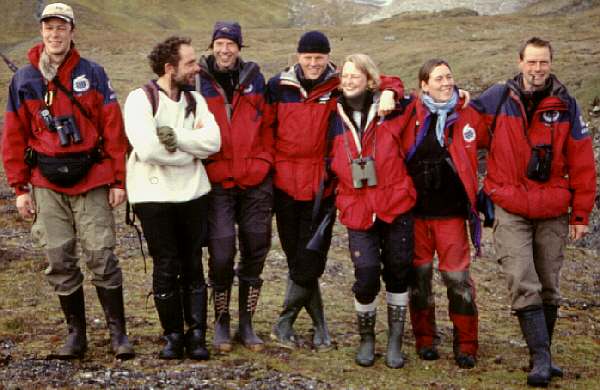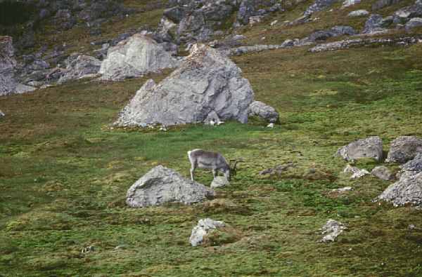 Nach dem Frühstück werden gleich die Zodiacs wieder zu Wasser gelassen und wir landen am Eingang des Isfjorden bei Trygghamna am Alkehornet (78° 12.875' N 13° 50.519' E). Hier können wir Svalbardrentiere beobachten. Sie unterscheiden sich von den in Nordnorwegen verbreiteten Rentieren durch ihren kleineren Körperbau, sie sind gut an das Leben in der Arktis angepaßt. Außerdem werden sie nicht, wie in Nordnorwegen, als Haustiere gehalten sondern leben wild. Hier gibt es auch wieder einen Vogelfelsen mit viel Vogelgeschrei und wieder eine Trapperhütte.