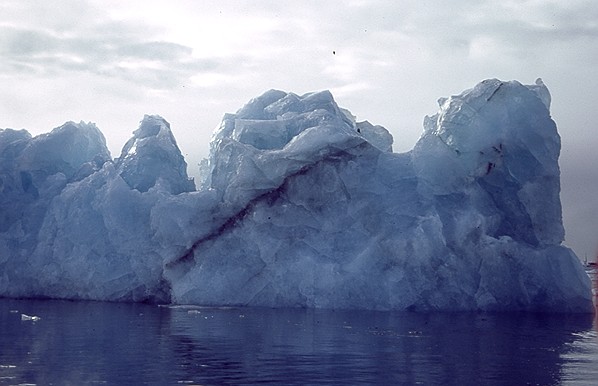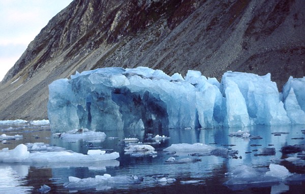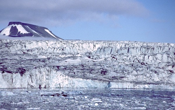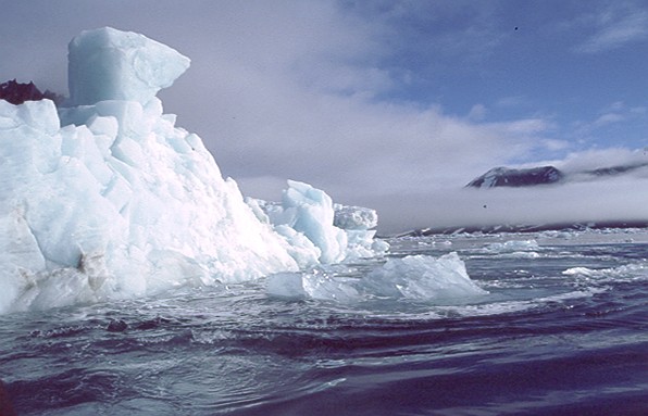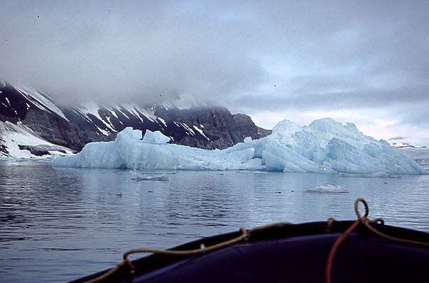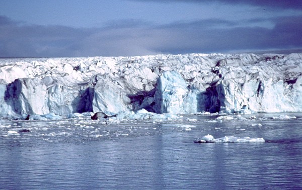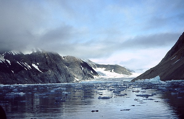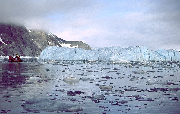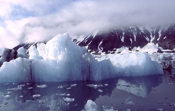 eine Gletscherfront und unzählige Eisbrocken im Wasser an. Die Bewölkung ändert sich ständig und mit