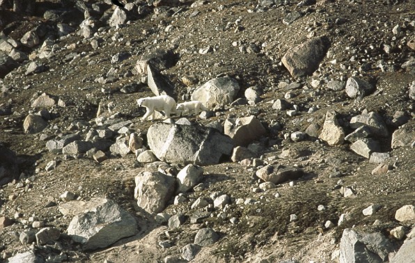 Plötzlich entdeckt jemand einen weißen Punkt etwa einen Kilometer von uns entfernt im Geröll. Bewegt der sich?