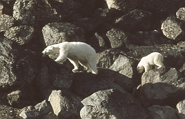 Was ist das? Gespannt wird er mit den Ferngläsern beobachtet. Ein Eisbär! Nein zwei. Eine Mutter mit einem