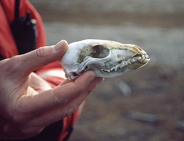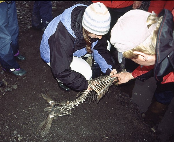 Wir wandern entlang des Strands, finden viel Eis und das Skelett von einer Robbe. Es wird von allen Seiten interessiert