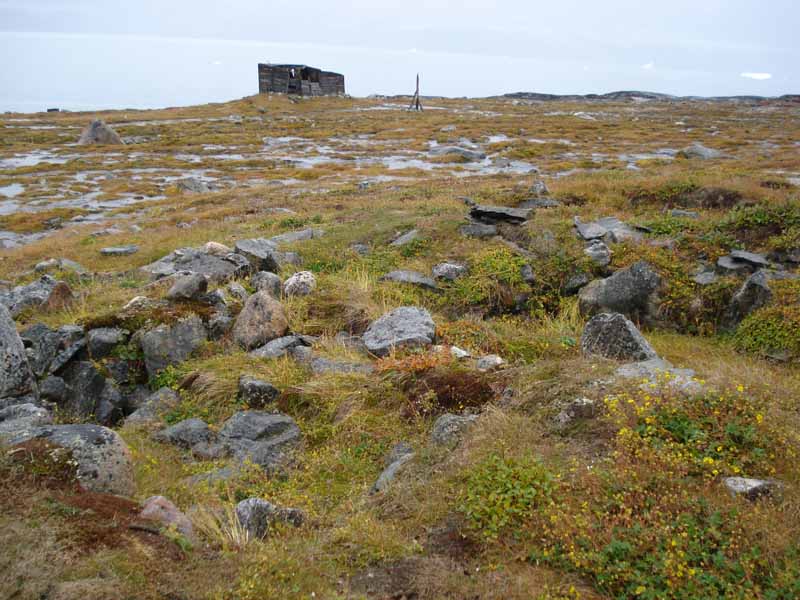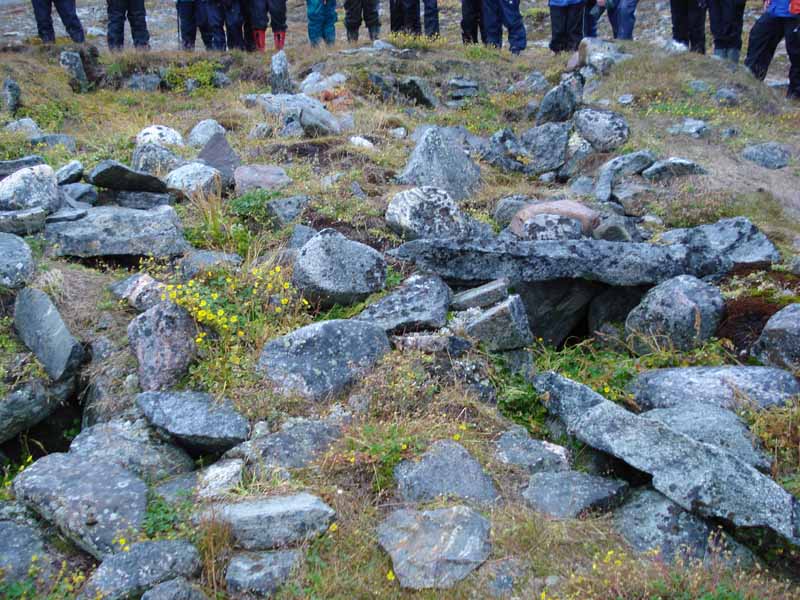 die überreste von Häusern der Thulekultur und eine ziehmlich kaputte Jagdhütte. Wir besteigen einen Berg.