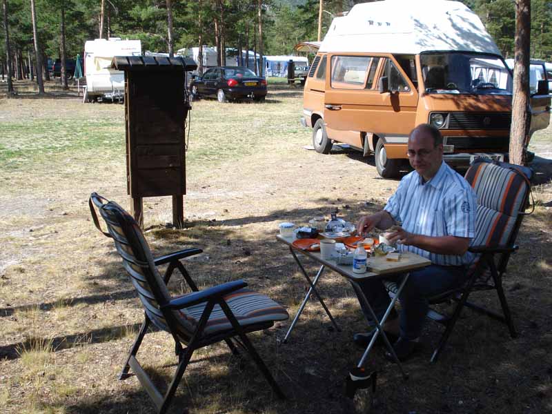 Wieder blauer Himmel, warm bis heiß! Frühstück zwischen Bäumen auf einem Campingplatz im Wald.