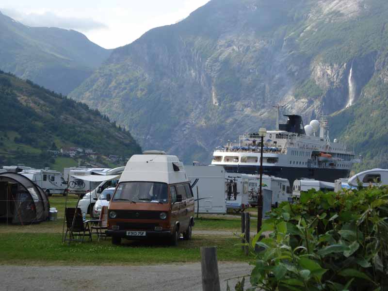 Campingplatz mit Schiff, der Geirangerfjord ist ein beliebtes Kreuzfahrtziel