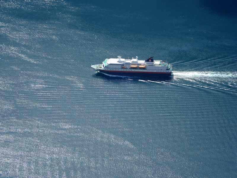 Ein Hurtigrutenschiff kommt in den Fjord