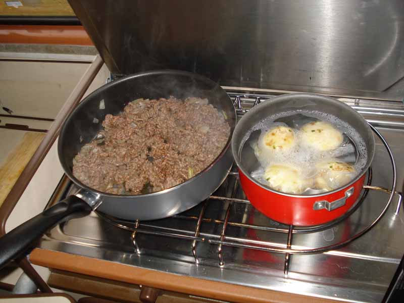 Abendessen: Wieder einmal Rosenkohl, diesmal mit Klößen und Hackfleisch.