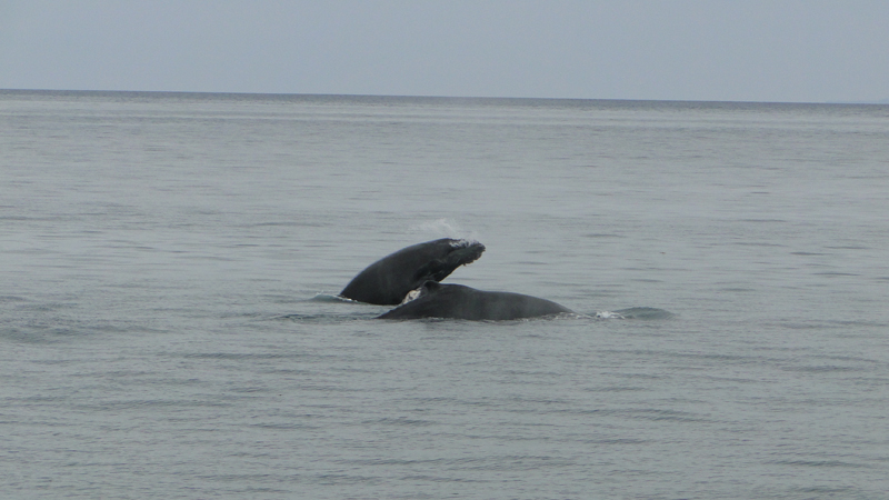 Zwei Wale, Mutter mit Jungtier, zeigen eine ganz besondere Show: Sie springen aus dem Wasser mit einem eleganten