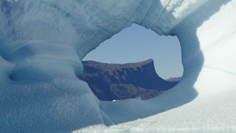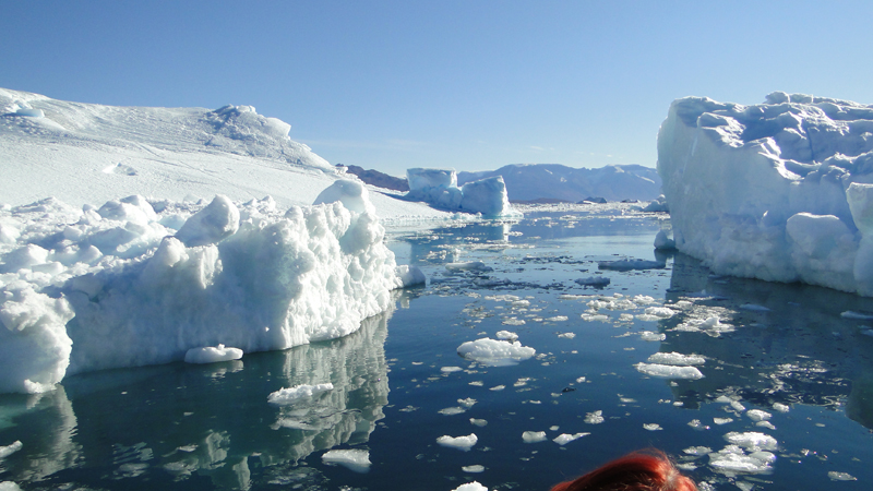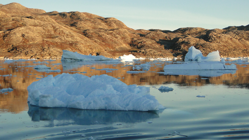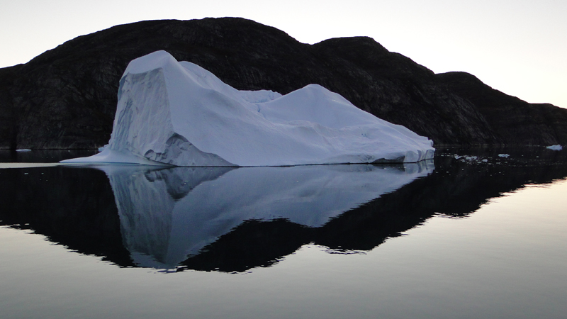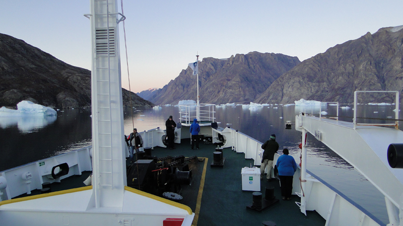 Später am Abend fährt das Schiff weiter durch einen engen Teil des Scoresbysunds in dem es jede Menge Eisberge
