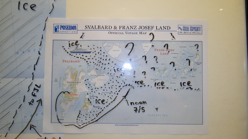 Die Eisverhältnisse machen das Anlanden des Zodiacs von unserem Schiff unmöglich so dass es auf morgen